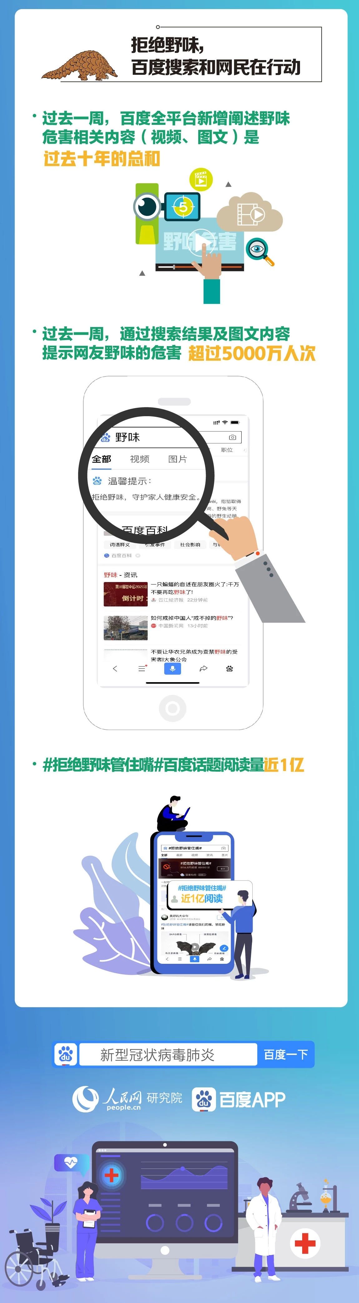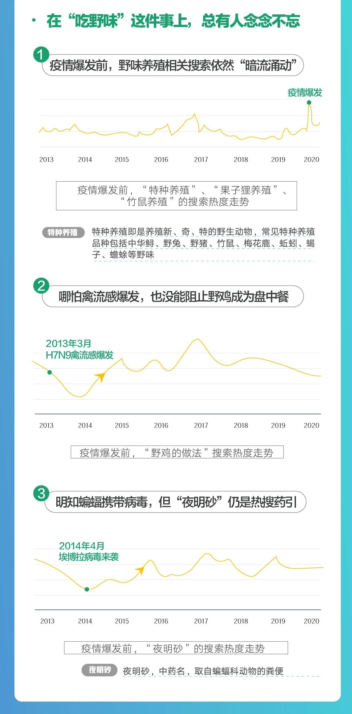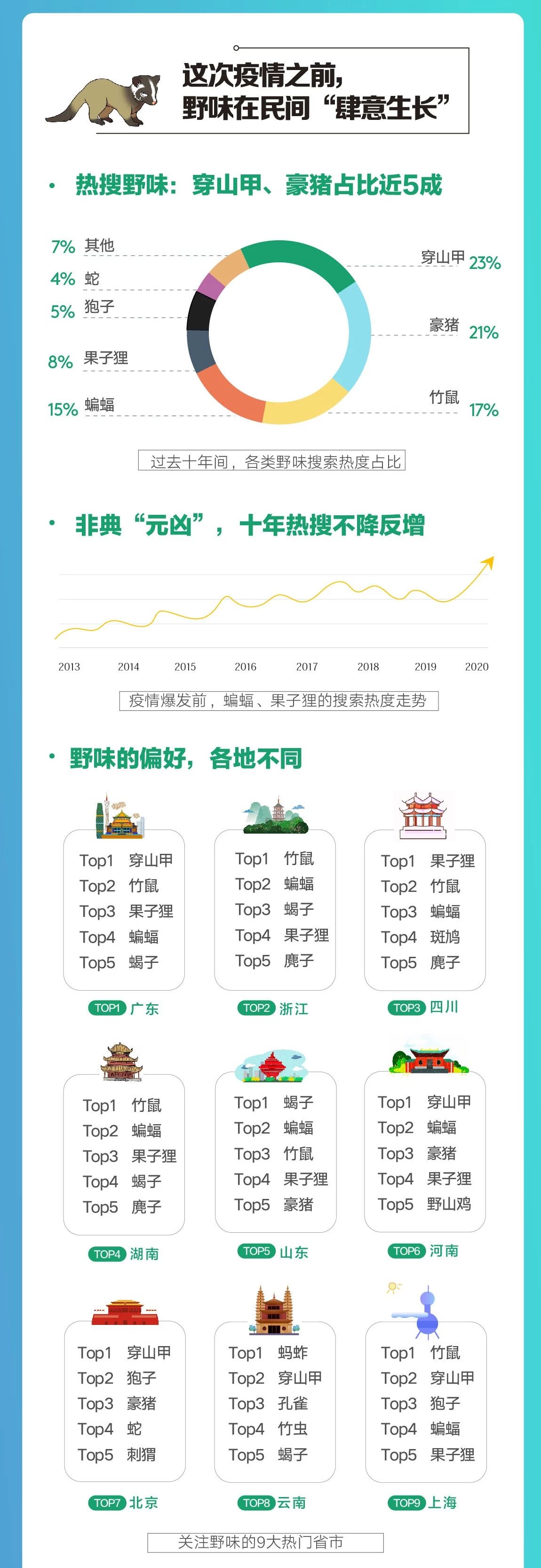 而一场疫情,也将“野味”重新拉回大众视野。报告数据显示,在过去近十年里,穿山甲和豪猪是人们最为关注的野味,占比近5成。而蝙蝠和果子狸在“非典”后走势不降反升。疫情爆发之后,人们对于“野味”的搜索和关注度达到了历史峰值,人们也开始意识到了“野味”的危害。数据显示,过去一周,百度全平台新增的阐述野味危害相关内容量是过去十年的总和,野味的危害、野味有哪些、蝙蝠携带的病毒等问题成为网民搜索野味时最关注的内容。