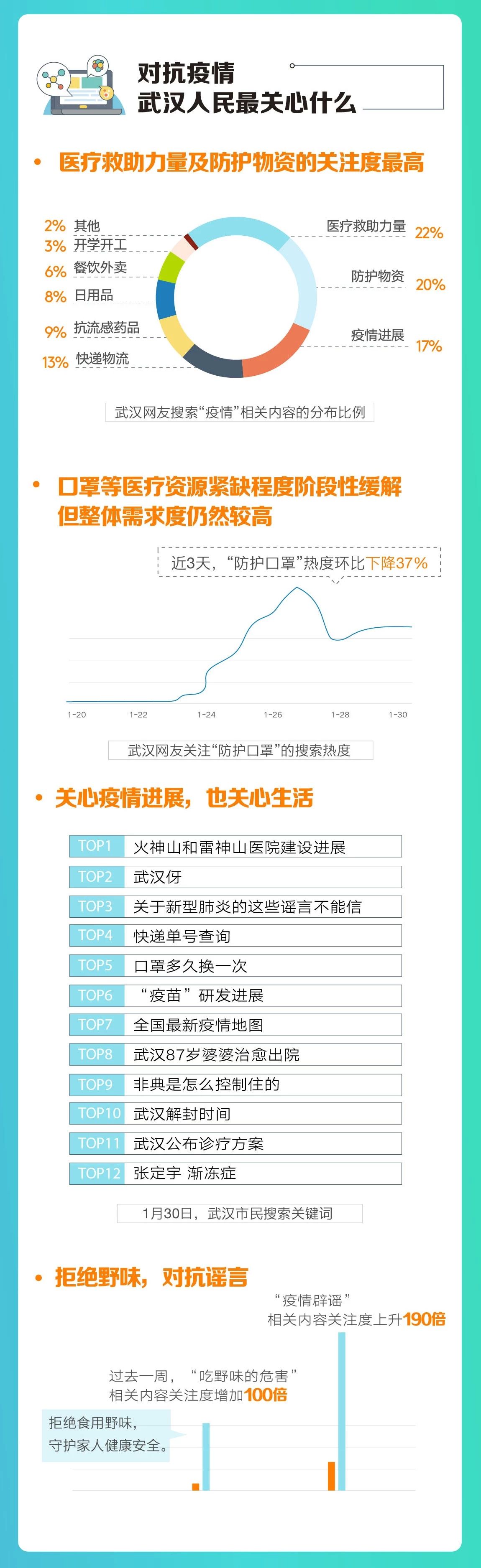 尽管在各方援助之下,武汉当地医疗物资缺乏的情况得到阶段性缓解,但需求仍然强烈。数据显示,近3天,“防护口罩”热度环比下降37,但整体数值仍处高位。报告同时揭示了武汉的另一重现状:频繁出现的各种谣言对武汉人民也造成了不小的干扰,武汉人民对辟谣内容关注度在过去一周上升190倍。