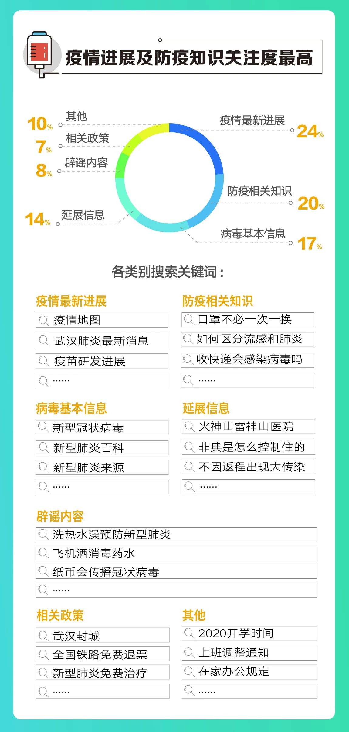 报告显示,用户通过百度搜索、浏览新型冠状病毒肺炎相关信息日均超过10亿人次。当下人们更关注疫情进展及防疫知识:疫情地图、疫苗研发进展、口罩不必一次一换等问题的搜索量均有明显上升;同时,与新型冠状病毒相关的延展信息也成为搜索热点,如火神山雷神山医院、非典是怎么控制住的信息等。