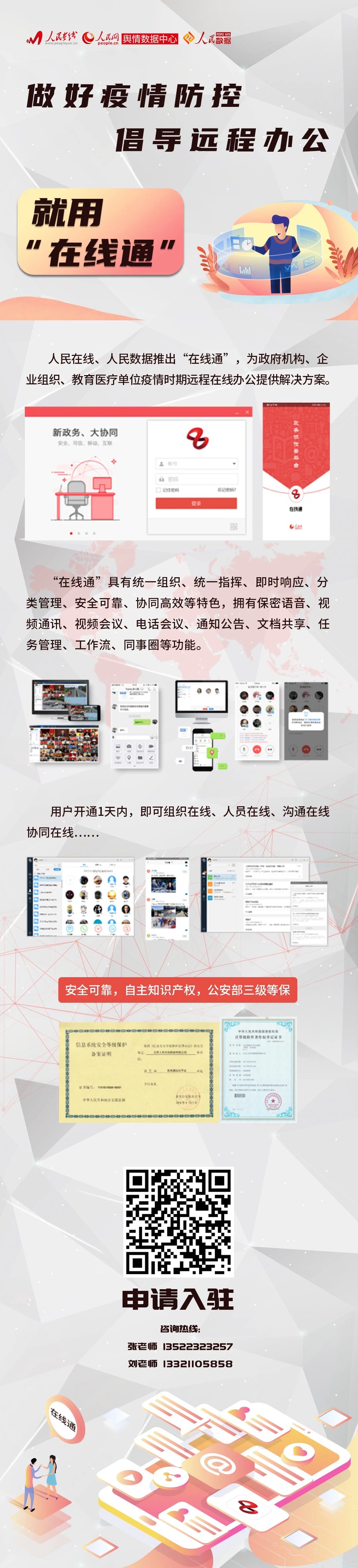 “在线通”具有统一组织、统一指挥、即时响应、分类管理、安全可靠、协同高效等特色,拥有保密语音、视频通讯、视频会议、电话会议、通知公告、文档共享、任务管理、工作流、同事圈等功能。