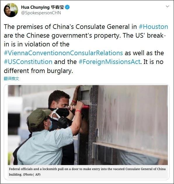 华春莹写道:中国驻休斯敦总领事馆的房屋是中国政府的财产,美方的闯入行为违反了《维也纳领事关系公约》,也违反了美国《宪法》和《驻外使 ...