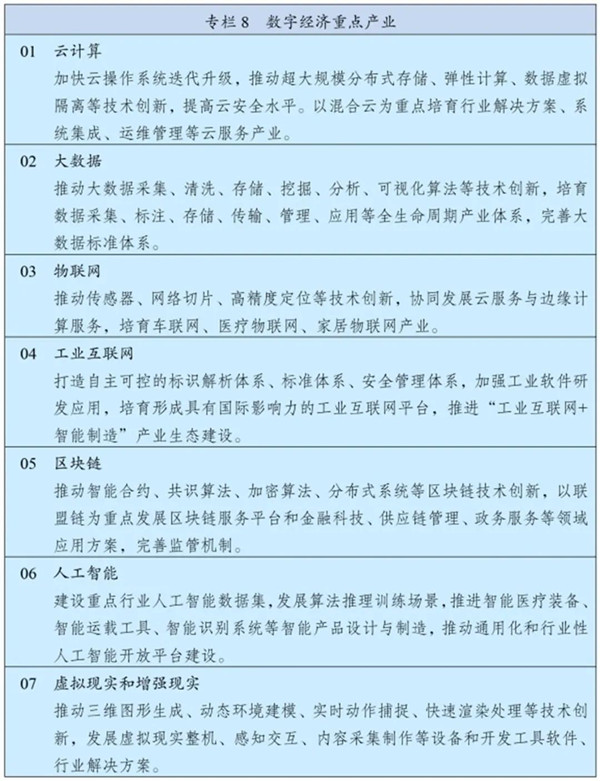 “第三节 推进产业数字化转型”重点规划大数据的应用。其中“大数据”的专栏内容丰富,包含“推动大数据采集、清洗、存储、挖掘、分析、可视化算法等技术创新,培育数据采集、标注、存储、传输、管理、应用等全生命周期产业体系,完善大数据标准体系”等内容,是对大数据发展的集中论述。