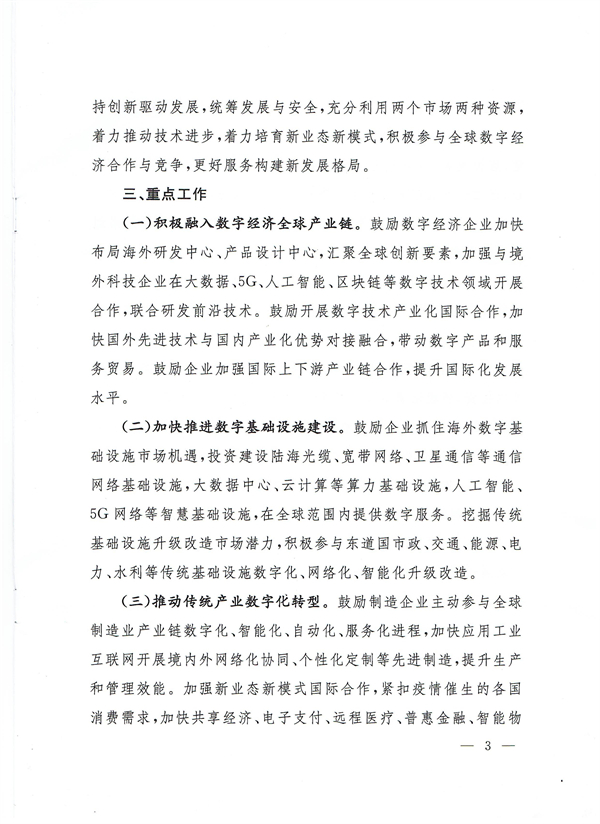 此外,鼓励企业抓住海外数字基础设施市场机遇,投资建设陆海光缆、宽带网络、卫星通信等通信网络基础设施,大数据中心、云计算等算力基础设施,人工智能、5G网络等智慧基础设施,在全球范围内提供数字服务。挖掘传统基础设施升级改造市场潜力,积极参与东道国市政、交通、能源、电力、水利等传统基础设施数字化、网络化、智能化升级改造。