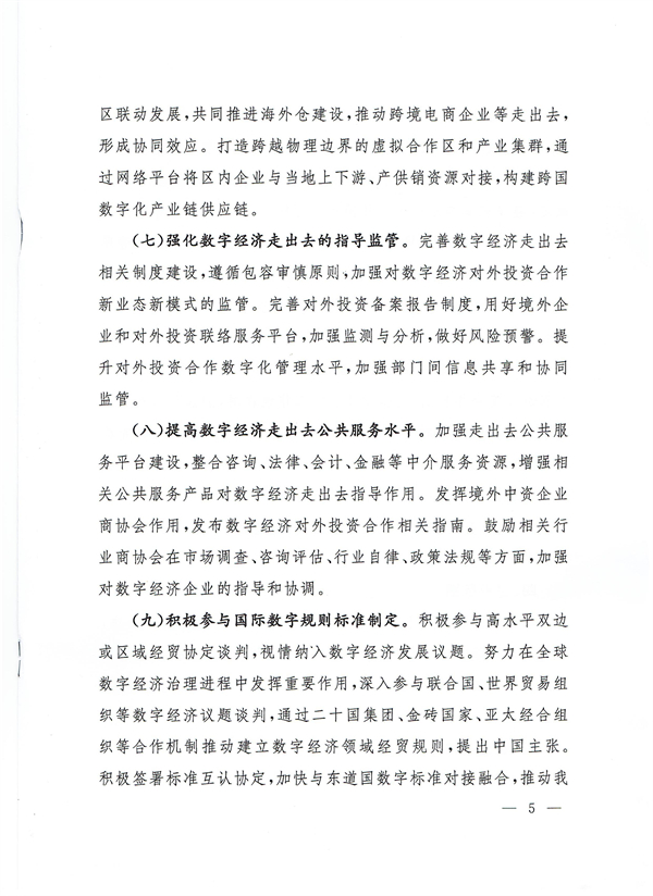 做好数字经济走出去风险防范。鼓励数字经济企业完善内部合规制度,严格落实我国法律法规有关数据出境安全管理的规定,遵守东道国法律法规及国际通行规则,妥善应对数字经济领域审查和监管措施。提高知识产权保护意识,健全数据安全管理制度,采取必要技术措施,保护数据安全和个人信息,支持企业通过法律手段维权。密切跟踪全球数字经济反垄断及加征数字税最新政策动向,做好应对准备。
