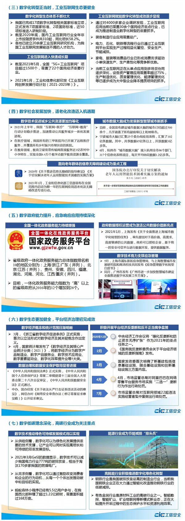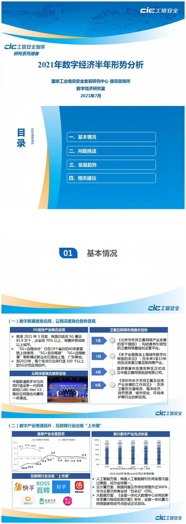 日前,国家工业信息安全发展研究中心在“工信安全智库”系列报告在线发布活动发布《2021年数字经济半年形势分析》研判报告。报告指出,数字新基建重应用,云网深度融合趋势显现;数字产业增速回升,互联网行业出现“上市潮”;数字化转型正当时,工业互联网生态更健全;数字社会发展加快,适老化改造迈入机遇期;数字政府能力提升,应急响应应用持续深化;数字生态更加健全,平台经济治理初见成效;数字低碳理念深化,高碳行业成为关注重点。