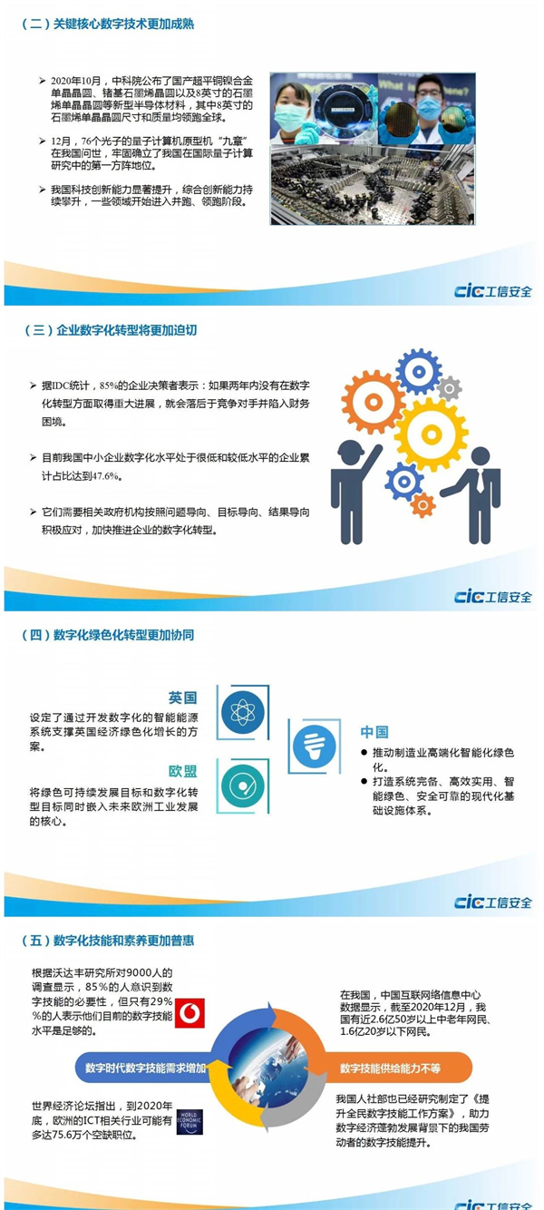 未来,我国数字经济发展将呈现出以下几大趋势:云网融合一体化更加深化;关键核心数字技术更加成熟;企业数字化转型将更加迫切;数字化绿色化转型更加协同;数字化技能和素养更加普惠。