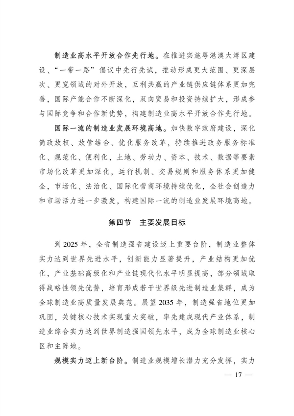 按照《规划》,到2025年,广东制造强省建设迈上重要台阶,制造业整体实力达到世界先进水平,培育形成若干世界级先进制造业集群,成为全球制造业高质量发展典范。展望2035年,关键核心技术实现重大突破,率先建成现代产业体系,制造业综合实力达到世界制造强国领先水平,成为全球制造业核心区和主阵地。