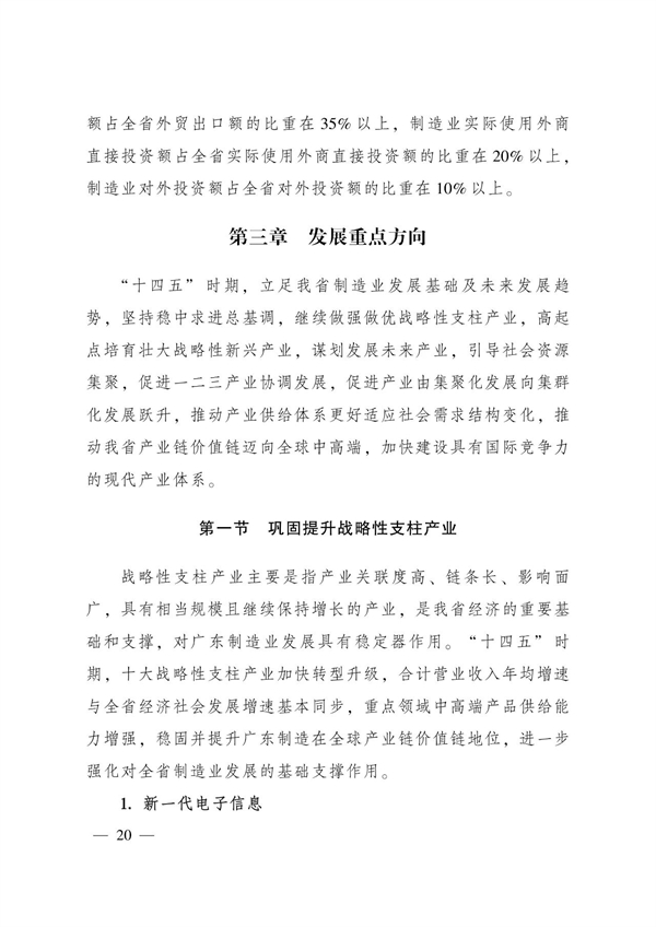 巩固提升战略性支柱产业。重点领域中高端产品供给能力增强,稳固并提升广东制造在全球产业链价值链地位。