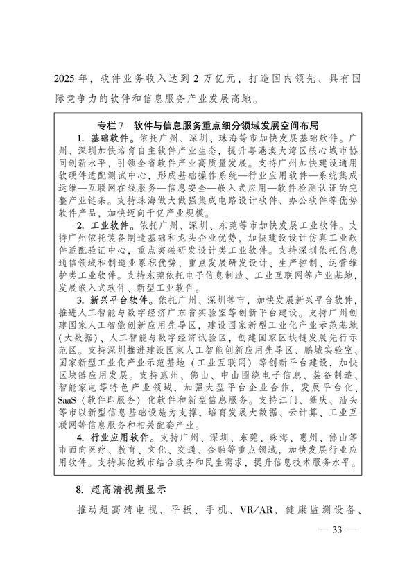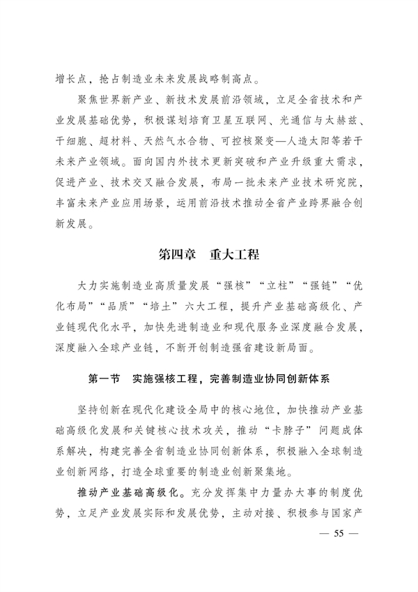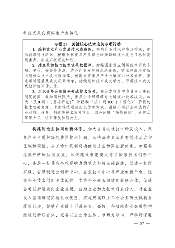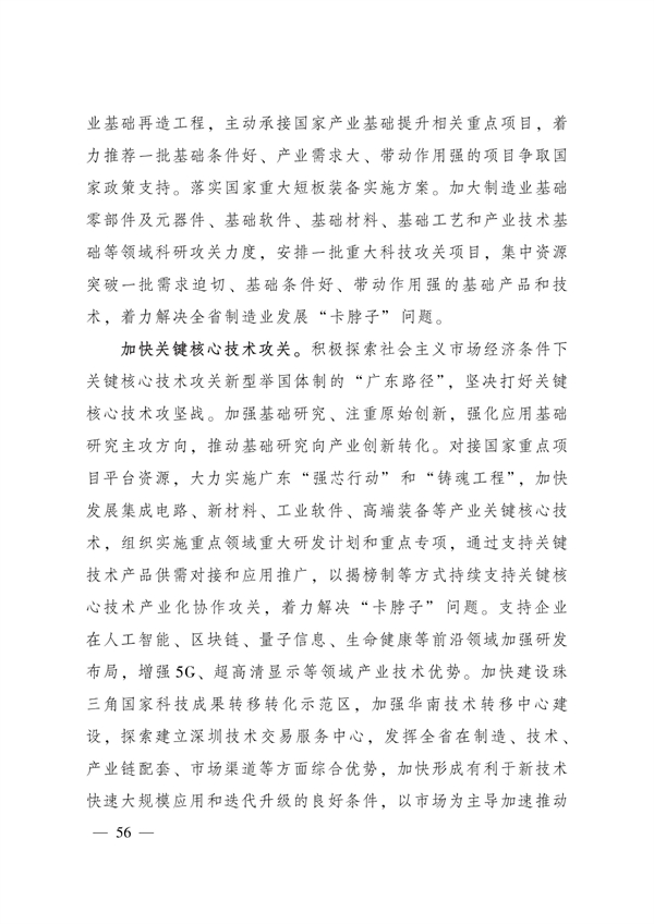 实施强核工程。构建完善全省制造业协同创新体系,打造全球重要的制造业创新聚集地。其中特别提到,要加快关键核心技术攻关,大力实施广东“强芯行动”和“铸魂工程”,加快发展集成电路、新材料、工业软件、高端装备等产业关键核心技术,以揭榜制等方式持续支持关键核心技术产业化协作攻关,着力解决“卡脖子”问题。