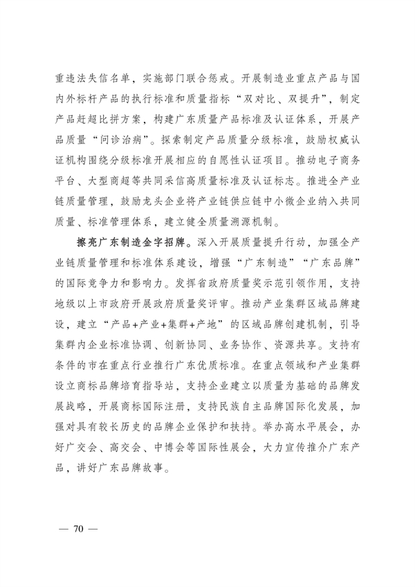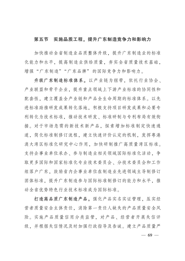 实施品质工程。提升广东制造竞争力和影响力,加快推动全省制造业品质整体升级,提升广东制造业的标准化能力和水平,提高制造业供给质量,夯实全省质量技术基础,增强“广东制造”“广东品牌”的国际竞争力和影响力。