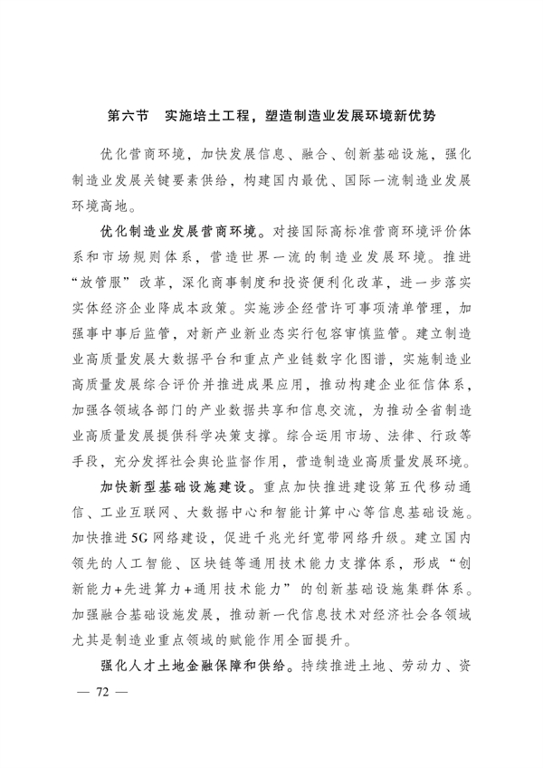 实施培土工程。塑造制造业发展环境新优势。优化营商环境,加快发展信息、融合、创新基础设施,强化制造业发展关键要素供给,构建国内最优、国际一流制造业发展环境高地,支持制造业企业上市挂牌及发行债券融资。