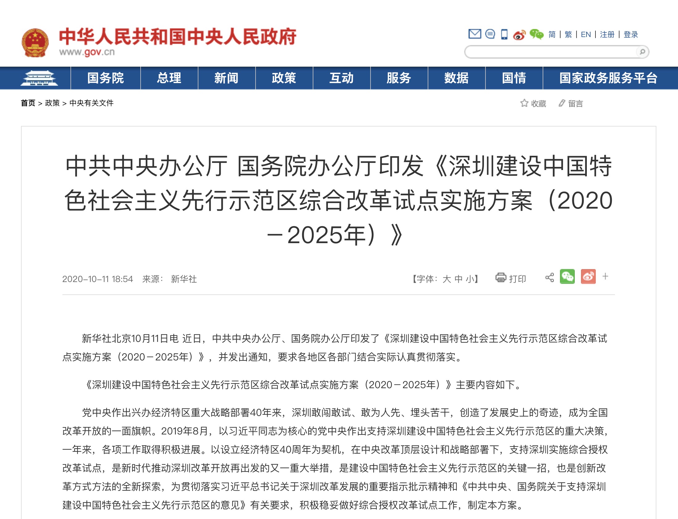 近日,中共中央办公厅、国务院办公厅印发了《深圳建设中国特色社会主义先行示范区综合改革试点实施方案(2020-2025年)》,并发出通知,要 ...