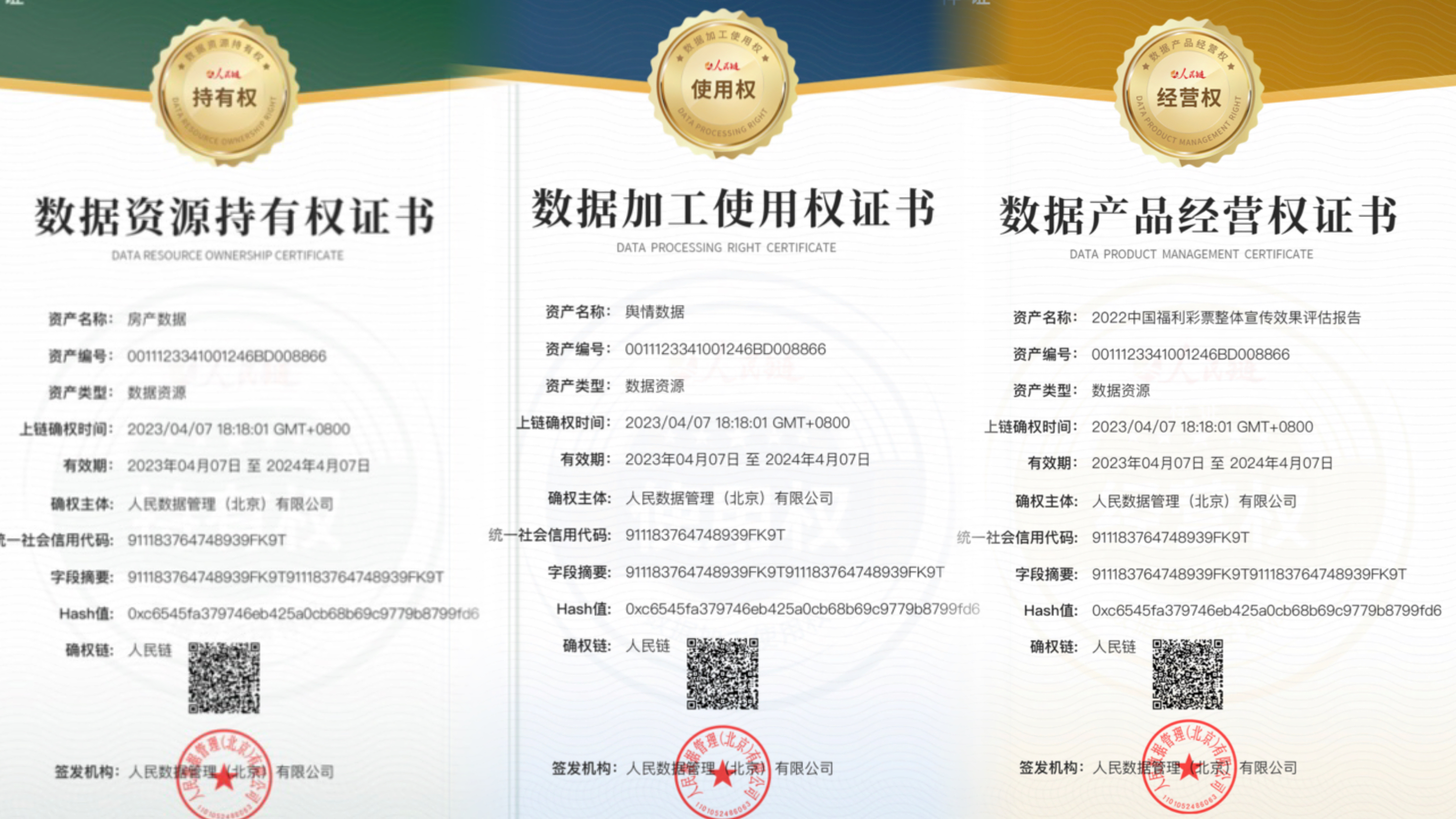 7月11日,由人民网·人民数据管理(北京)有限公司针对数据要素市场打造的数据资源持有权证书数据加工使用权证书数据产品经营权证 ...