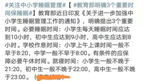 相关数据显示,我国80%中小学生的睡眠时长不达标。睡眠时间的长短直接影响到了学生的身体健康,关于学生睡眠时长的问题一直都受到了家长和社会的关注。根据《通知》要求,小学上午上课时间不能早于8:20,中学一般不早于8点。要保障午睡时间。就寝时间小学生一般不晚于21:20,初中生一般不晚于22:00,高中生一般不晚于23:00。休息时间再次明确,同时配套的还推出了具体的政策来保证学生的睡眠时长。为何官方如此强调学生的睡眠休息时间呢?其实来自一份2018年的社会调查问卷中早就道出了这其中的原因。