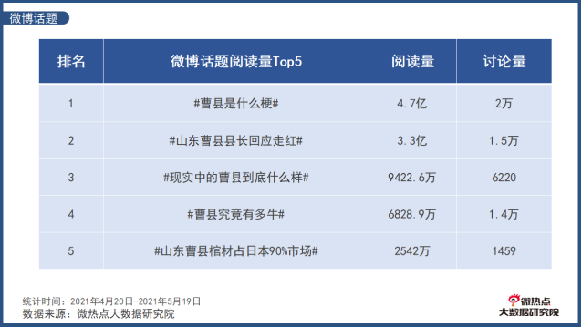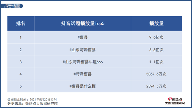 据人民数据(国家大数据灾备中心)舆情系统的统计,从4月20日到5月19日,关于曹县的全网信息量达到28.81万条。而微博平台上与之有关的#曹县是什么梗#等话题阅读总量超过了10.9亿,在抖音上曹县相关视频总播放量也超过15亿次。