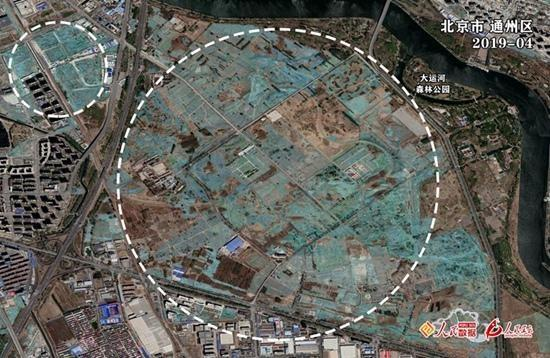 图:人民星云卫星遥感观测显示,2019年4月,城市绿心森林公园土地腾退基本完成,正在加紧建设。图片出自:人民网