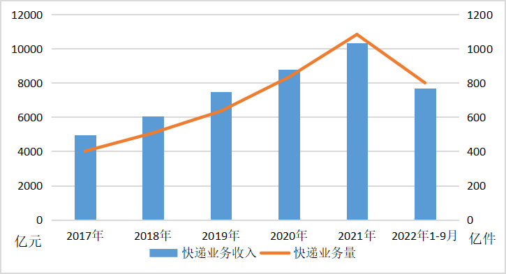 图:2017年至2022年全国快递业务量和快递业务收入变化情况