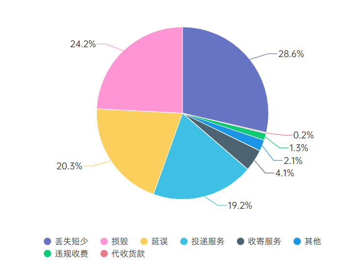 第二,“快而不递”成常态。数据显示,针对快递服务的问题申诉中,主要问题是快件丢失短少、快件损毁和快件延误,分别占申诉总量的28.6%、24.2%和20.3%。“快而不递”现象成业内潜规则、“最后一公里”的痛点难以解决,尤其是部分农村地区快件仅到乡镇,影响消费者的购物体验。人们生活水平的提高,对快递的需求量也有所增加,对快递服务质量提出更高的要求。