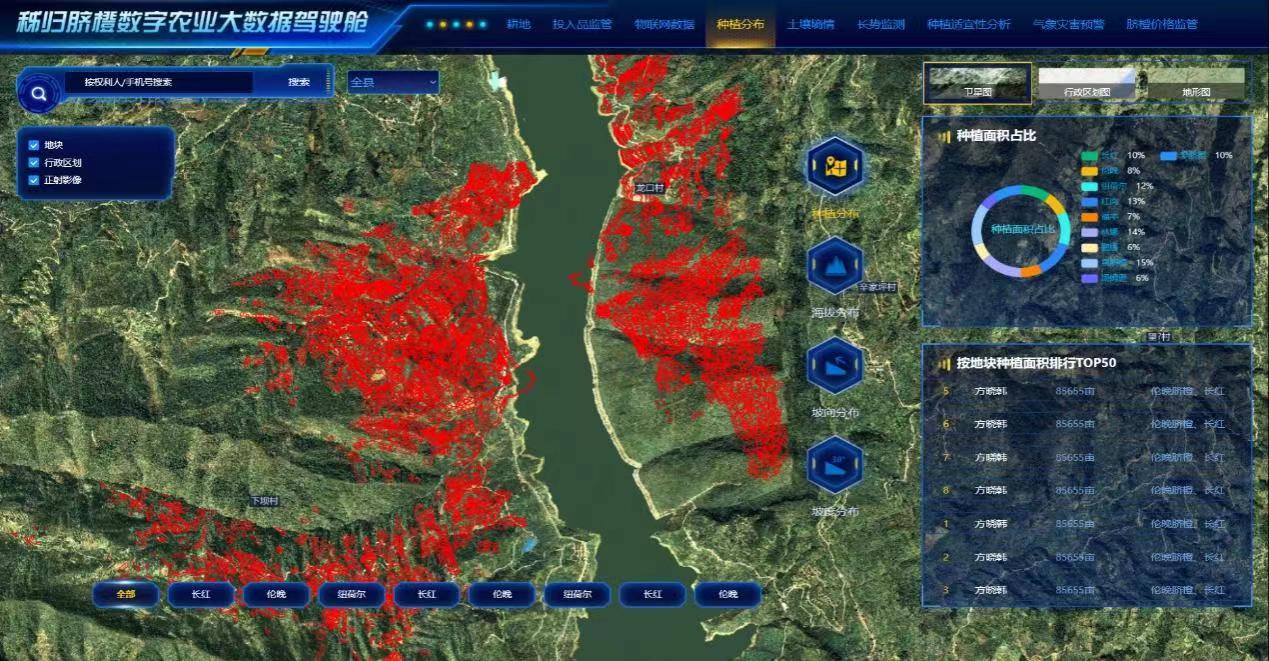此外,人民数据还展示了“秭归脐橙产业大脑”应用场景。该平台聚焦秭归核心脐橙产业,将农业土地资产、农产品、农户等数据要素资产化,推进秭归农业农村数据资产管理稳定实施;推进农业农村数据资源以通促产的方式转变,激活农业数据资产的融资潜能;推进空天地一体化技术在农业生产中的应用,提升数字化生产能力。值得一提的是,该平台实现数据的集成与汇交、深度融合与综合分析可视化监管;实现农产品种植、物流、消费的完整溯源,健全秭归脐橙相关产业数据共享机制,研制集成统一、开放、共享、智能、高效的脐橙确权与流通的大数据平台。