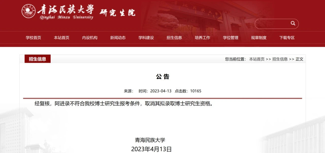 4月13日,青海民族大学发布公告称,经复核,阿进录不符合该校博士研究生报考条件,取消其拟录取博士研究生资格。