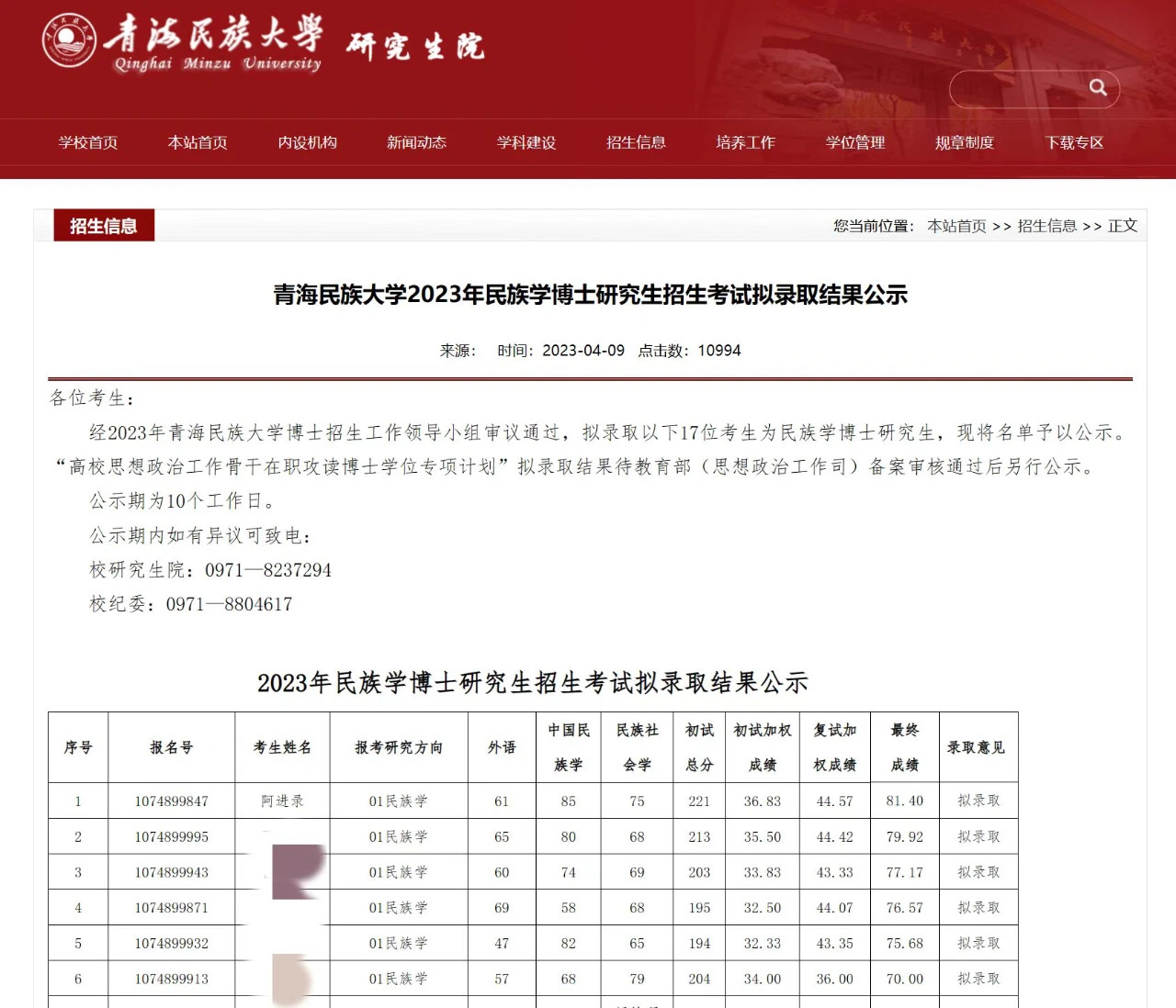查阅青海民族大学研究生院官网消息,4月9日,该校发布《青海民族大学2023年民族学博士研究生招生考试拟录取结果公示》。该公示称,经2023年青海民族大学博士招生工作领导小组审议通过,拟录取17位考生为民族学博士研究生,现将名单予以公示。