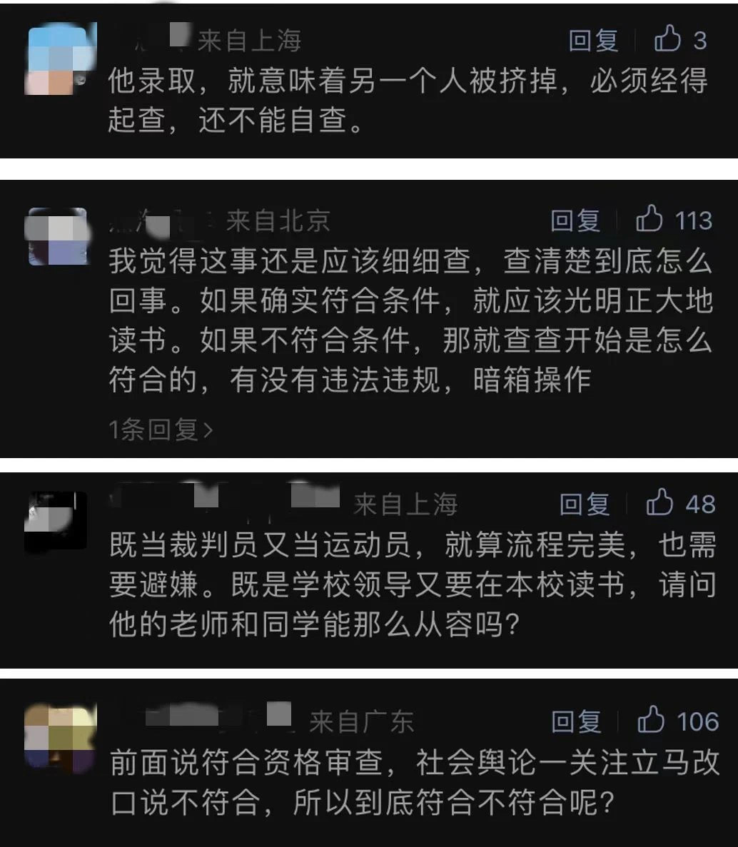 更令人摸不到头脑的就是学校既然言之凿凿“所有程序都符合规定”,为何这件事在网上发酵后,24小时之内又忽然“经复核”确认其不具备拟录取资格呢?网友们不禁发文:“谁复核的,网友复核吗?”如果这件事本就不符合规章制度,当初究竟是谁为这件事开了绿灯?而不具备拟录取资格,究竟是哪一条不符合资格呢?是“原则上”规定的年龄,还是其他?学校并没有详细说明。此番乌龙事件究竟是各环节上的工作人员及考生本人一时疏忽,还是为位高权重者“网开一面”之后因舆论压力又赶紧调整录取结果?这些,我们都无从知晓,学校方面在面对舆论做出的回应也没有进一步解释说明。种种的不透明和信息不对称,都让网友们对这件事更加疑窦丛生。