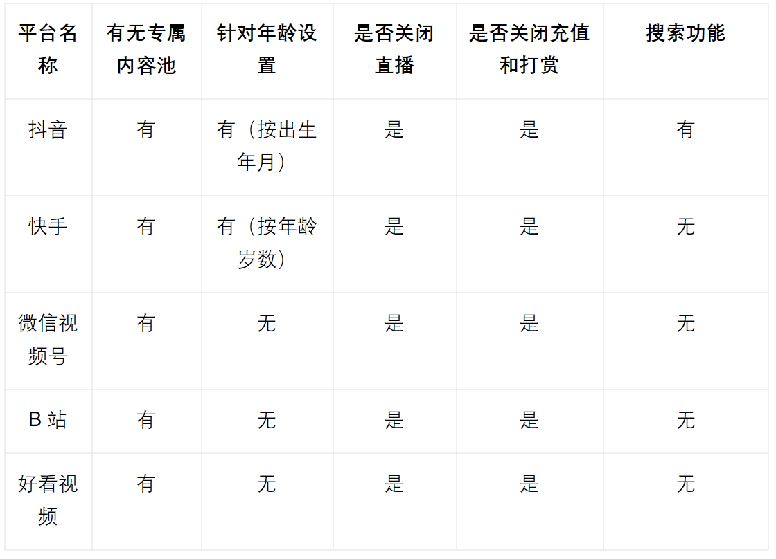 人民数据研究院对抖音、快手、微信视频号、B站、好看视频五大短视频平台“青少年模式”测评发现,各平台均上线了青少年模式,仅抖音和快手平台针对青少年采取按具体年龄的分级措施,并匹配相应的内容池,微信视频号、B站、好看视频只有一套固定的内容池,未做年龄等维度的细分。因此,在内容设置上,抖音和快手的内容更具针对性。