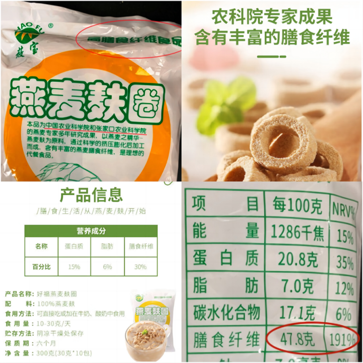 一款名为“好福燕麦麸圈”的产品宣称是“中国农科院与张家口农科院燕麦专家多年研究”的“高膳食纤维食品”,经检测发现营养成分值明显低于标签标示值。随后,中国农业科学院发表官方声明称与该产品不存在任何关联;张家口农业科学院表示,从未授权该产品相关信息宣传,该产品与院方无关。