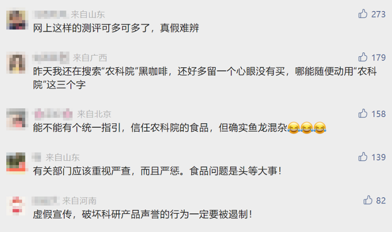 乱象的集中曝光引发舆论关注。不少网友表示,出于对权威机构背书的信任,“真情实感地买过好多‘农科院美食’”,但市面上打着相关旗号宣传的产品鱼龙混杂,无从分辨真伪。还有人对农科院相关科研合作与品牌管理提出质疑。