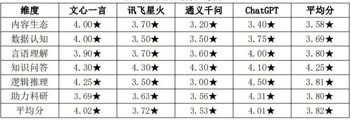 测评结果显示,四个AI大模型整体表现良好,总平均分为3.82星,其中,文心一言综合测评效果在四者中最优,综合评分为4.02星。综合来看,AI大模型在知识问答、助力科研、言语理解、逻辑推理四方面整体表现较好,而在内容生态、数据认知两方面的表现仍有一定提升空间,具体各维度情况如下: