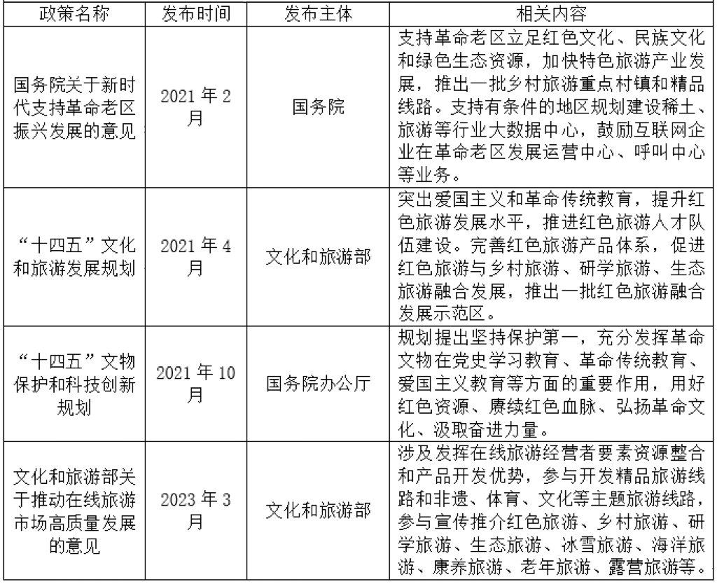 国家政策大力扶持,推动红色文旅融合发展。红色文旅因其红色基因内核具有极其重要的意义,是中国共产党宝贵的精神财富,对于爱国主义教育、弘扬民族精神、凝聚民族力量等具有强大的推动力,将爱国主义与旅游相结合,达到了“寓教于乐”的良好效果。党的二十大报告提出要“弘扬以伟大建党精神为源头的中国共产党人精神谱系,用好红色资源,深入开展社会主义核心价值观宣传教育,深化爱国主义、集体主义、社会主义教育,着力培养担当民族复兴大任的时代新人”以及“以文塑旅、以旅彰文,深化文旅融合发展”等要求,为红色旅游指明了发展道路。同时,多部门也相继发布了一系列政策,助推红色文旅的发展。