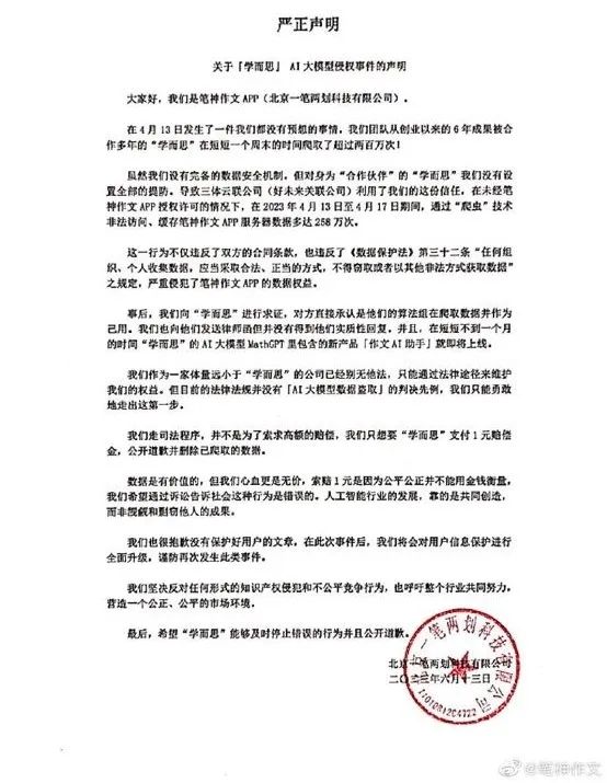 近日,笔神作文指控合作伙伴学而思未经授权爬取自家数据,在2023年4月13日到2023年4月17日期间,通过“爬虫”技术,非法访问、缓存服务器数据多达258万次随后学而思对此公开予以否认,表示自己对笔神作文的数据使用在双方合同的合作范围以内。