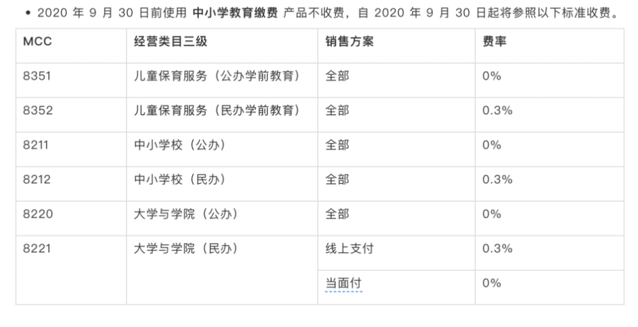 此外,在校园场景,支付宝也提供费率优惠。支付宝推出的中小学教育缴费产品中,在使用该产品的学前教育机构、中小学校、大学与学院中,对公办的全部采取零费率,对民办的大部分采取0.3%的费率。