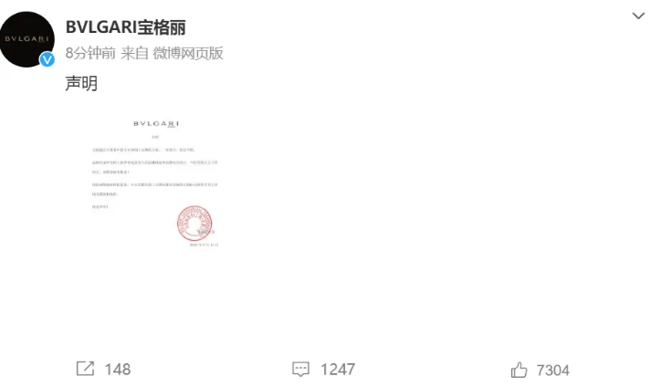 宝格丽发布的道歉声明称:宝格丽公司尊重中国主权和领土完整的立场,一如既往,坚定不移。品牌在海外官网上因管理疏忽发生的店铺地址标识误注,今日发现后已立即纠正对错误深表歉意!我们诚挚感谢网民监督,并正在联动第三方国际服务商确保正确标示海外官网上的相关国家和地区。