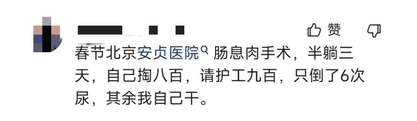 王女士的经历并非个例,刘女士住院期间也有相同经历。据央广网报道,今年3月份,刘女士在北京通州某医院做了腹腔镜手术。手术后,刘女士插了导流导尿管,无法下床。尽管如此,医院依然不允许家属进入病房陪护。院方解释称,这是按照此前疫情期间医院的规定沿用至今,并称对于生活不能自理的患者和老年患者,允许一个家属陪护。刘女士认为,医院对于“生活不能自理”的定义模糊。最终,刘女士以每天260元的价格,雇佣护工照顾自己。