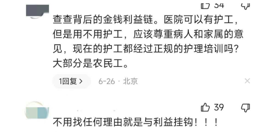 也有网友评论称,看病本身是一项大的经济支出,请护工又是一笔不小的开支,变相加重患者经济负担。病人家属照顾贴心和细致,不仅有利于病人康复,还能减轻患者经济支出。