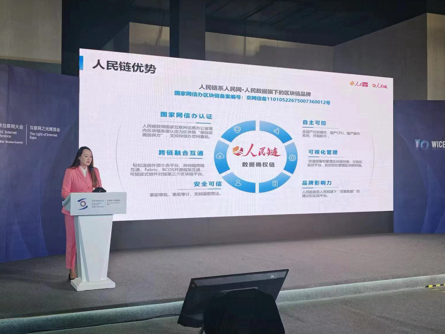 产品发布会发布了人民链。人民链是人民网·人民数据推出的区块链基础设施,通过网站的形式对外提供服务,是国密自主可控的一站式、可视化、高安全的综合区块链管理平台。人民链拥有“1+1+N”的产品服务体系,包含1个区块链BAAS平台、1个数据要素确权流转平台、N个区块链创新应用。人民数据早在2019年就推出了全国第一个数据确权平台。2023年2月,人民链通过中央网信办区块链基础链备案。作为基础设施服务链,面向全国提供数据上链、存证、确权、交易服务工作。