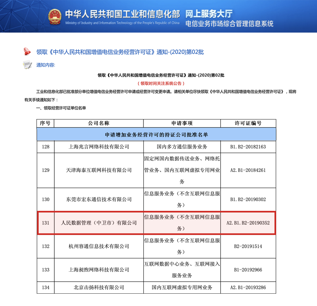 【喜讯】人民数据获得增值电信业务经营许可证