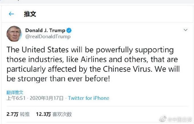 特朗普发推特称,美国将对航空工业等其他受“中国病毒(Chinese Virus)”影响的行业给予强有力的支持。我们将会变得更强大!