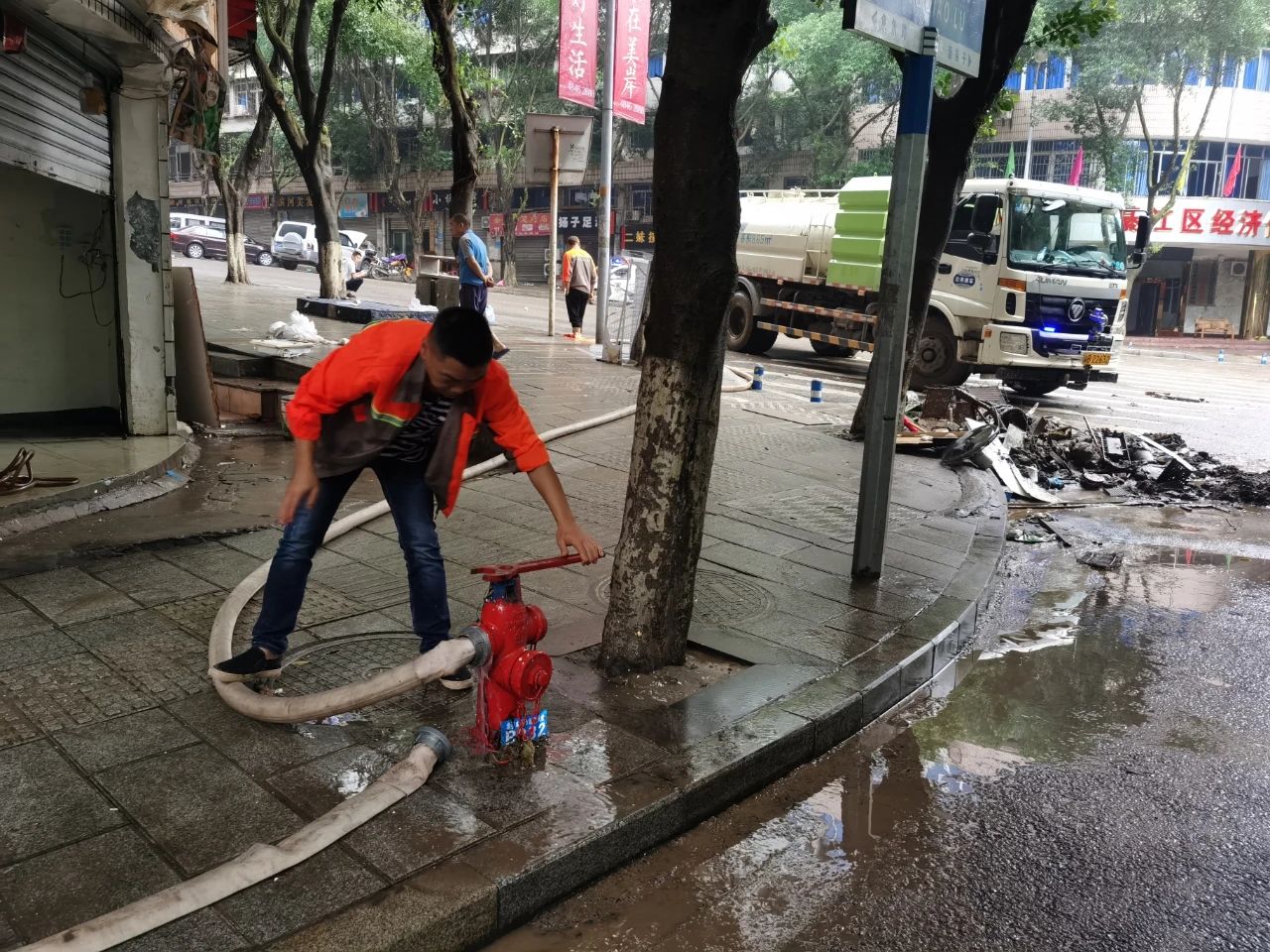 6月23日,随着本轮洪峰过境,洪水退去,相关部门立刻展开清淤消杀和排险工作。