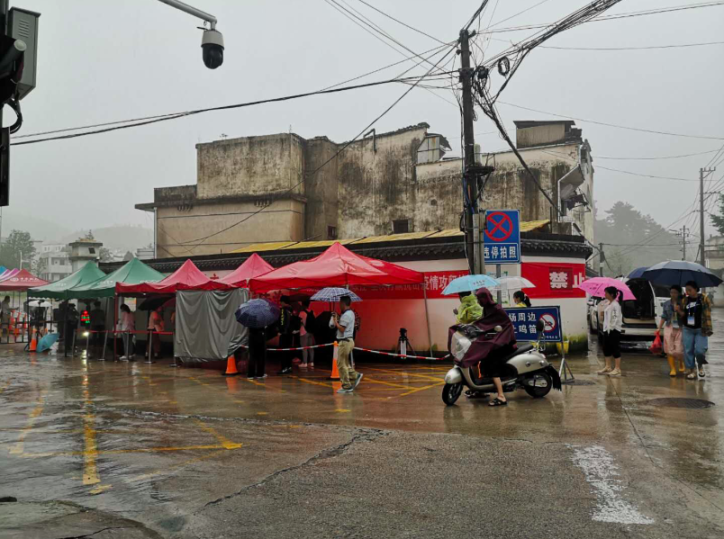 今早,中国青年报记者前往歙县中学考点,雨依然不小。