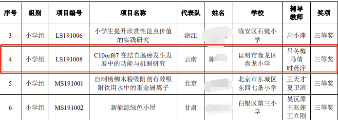 该项目获第34届全国青少年科技创新大赛三等奖、第34届云南省青少年科技创新大赛青少年科技创新成果竞赛项目一等奖。