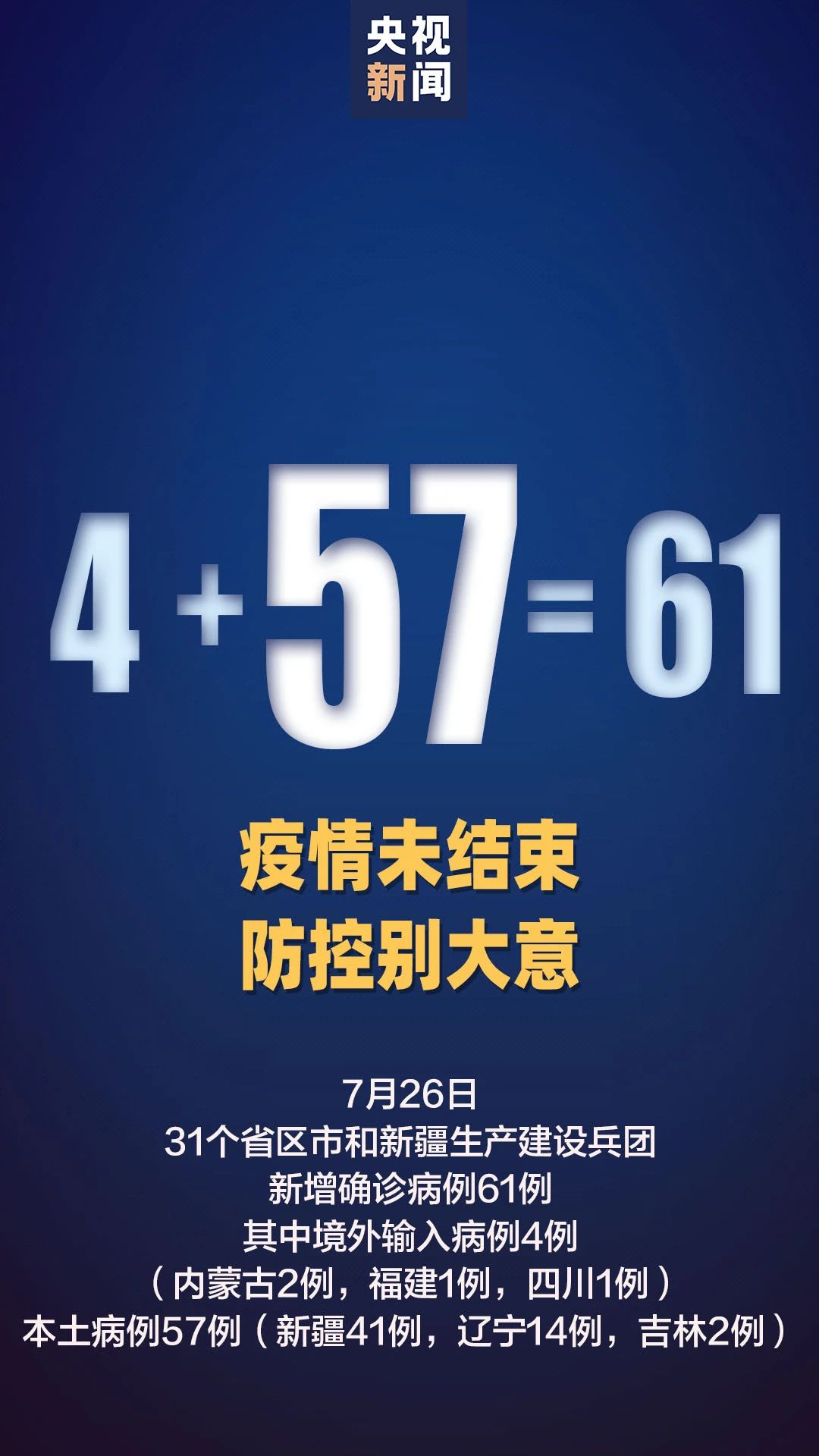 新疆维吾尔自治区卫健委今天通报,7月26日0时至24时,新疆维吾尔自治区(含新疆生产建设兵团)报告新增新冠肺炎确诊病例41例(其中15例为无症状感染者转确诊病例),均为乌鲁木齐病例;新增无症状感染者38例(乌鲁木齐市37例,兵团第十二师1例)。