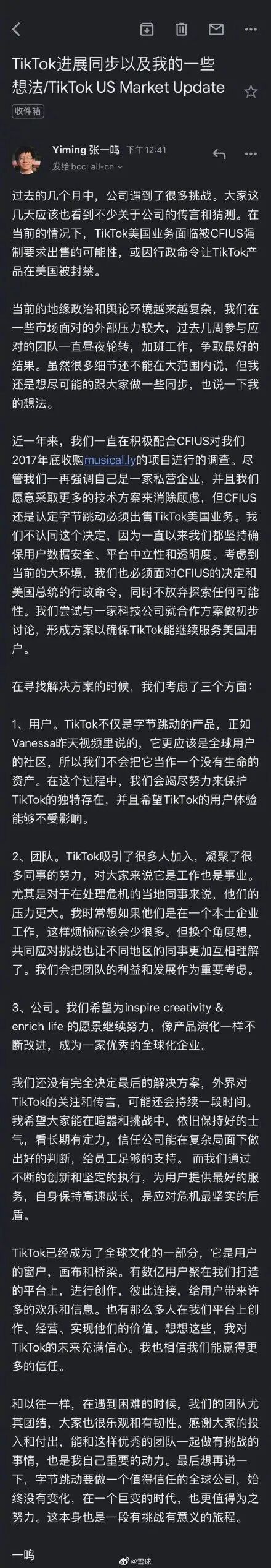 大概率会发生的事件是,字节跳动将失去TikTok在美国的业务。字节跳动创始人张一鸣在8月3日的内部信中表示,字节跳动正在与一家科技公司讨论,目标是保证TikTok这个App能在美国市场继续运营下去——这应该是他目前能期待的较好结局。