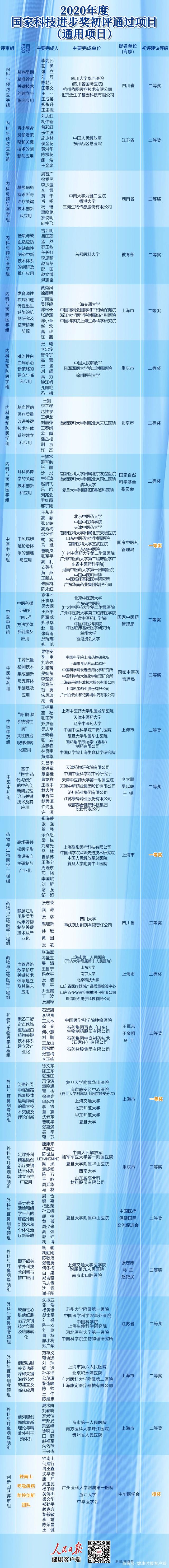 健康时报记者从这些初评通过的项目中观察看,2020年度国家自然科学奖初评通过项目中有4个项目是基础医学相关;2020年度国家技术发明奖初评通过项目(通用项目)中有2个项目是医药卫生相关;2020年度国家科技进步奖初评通过项目(通用项目)中25个医药领域项目,包括8个内科与预防医学组项目、5个中医中药组项目、4个药物与生物医学工程组项目、7个外科与耳鼻咽喉颌组项目、1个创新团队评审组项目。