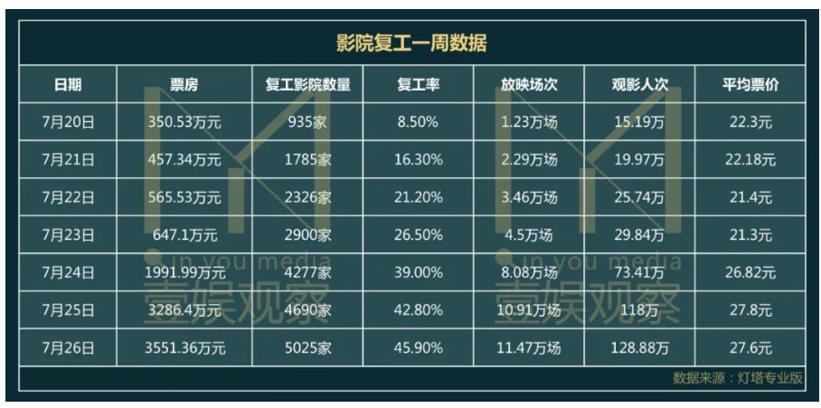 “1.09亿元票房,累计吸引409万观影人次。全国共5100家影院实现复业,复工率达到45.9%。”这是全国影院复工首周(7月20日-7月26日)交出的答卷。