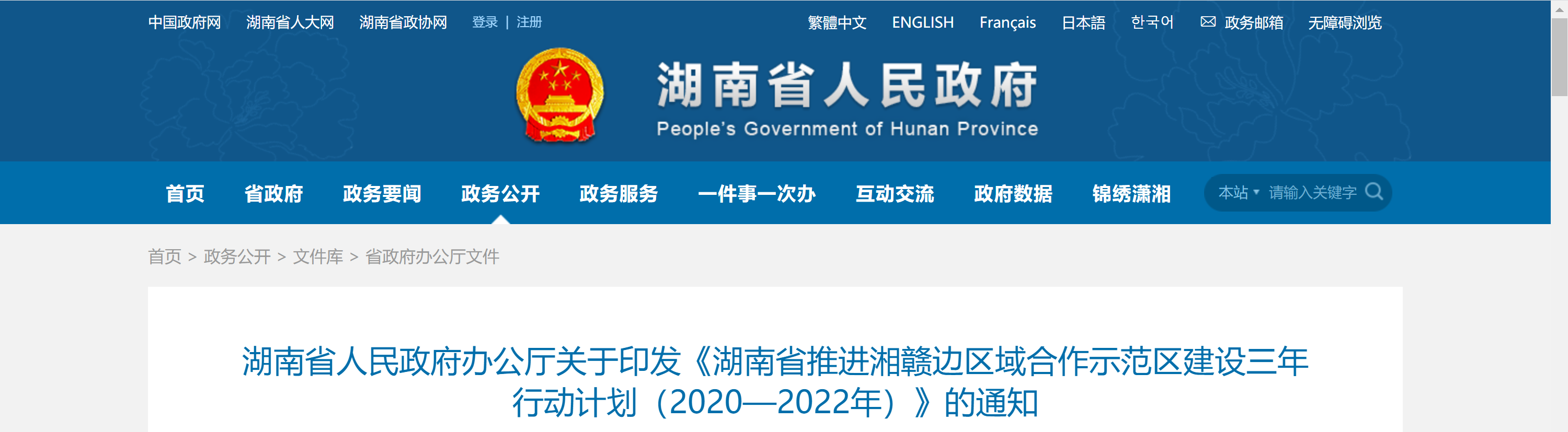 日前,湖南省人民政府办公厅印发《湖南省推进湘赣边区域合作示范区建设三年行动计划(2020—2022年)》。