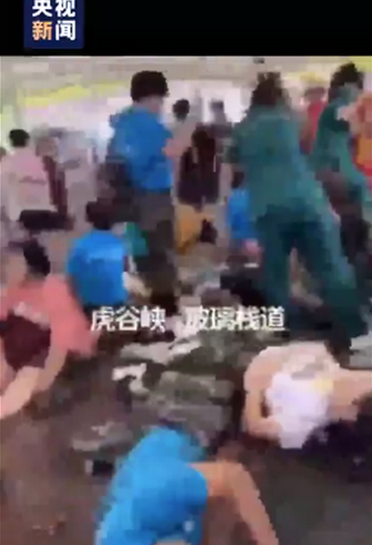 据央视新闻的视频显示,事故现场有游客倒在地上,景区工作人员将伤者抬上担架,有医护人员正在救治伤员。