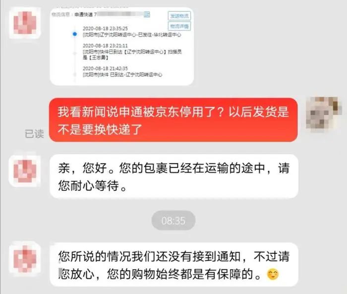 记者8月18日从京东第三方店铺下单,对方选择了申通快递仍可正常发货。被问到以后发货是否需要更换快递公司时,客服表示,“您说的情况我们还没有接到通知。请您放心,您的购物始终都是有保障的。”