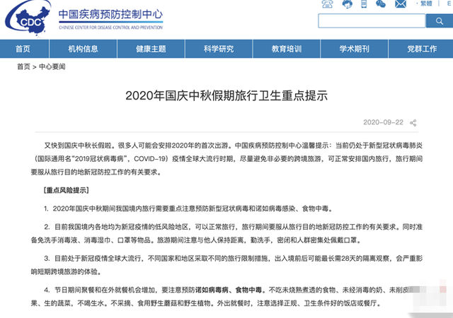 中国疾控中心发布国庆中秋旅行提示:当前仍处于新冠疫情全球大流行时期,国庆中秋跨境旅游最长或隔离28天,尽量避免非必要跨境旅游,可正常安排国内旅行,旅行期间要服从目的地防控工作要求。